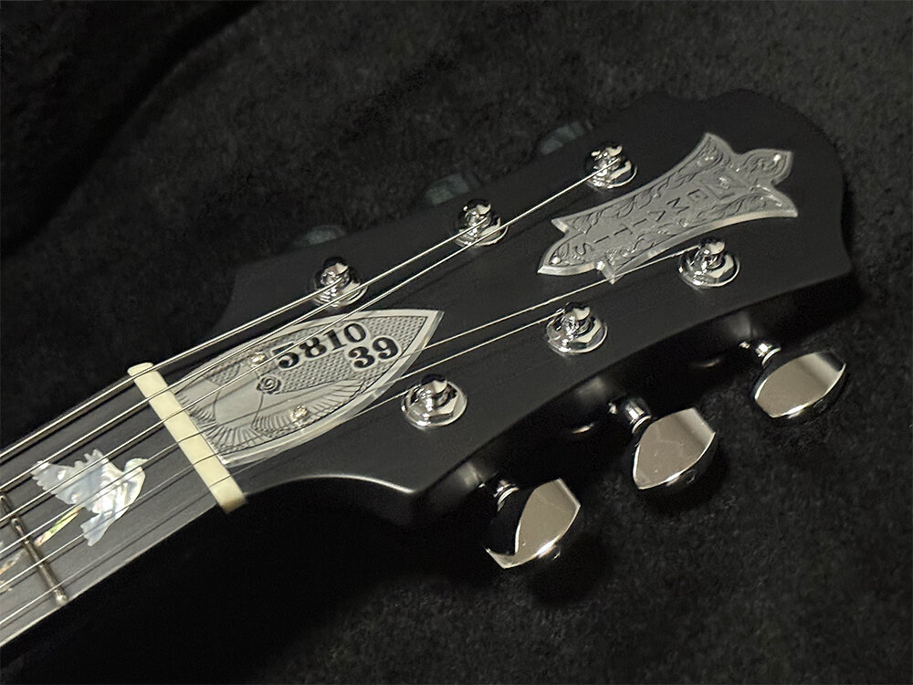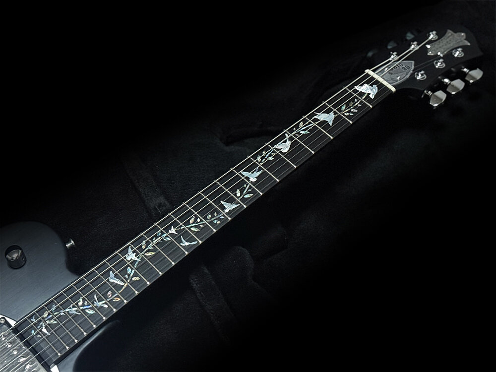 フィンガーボード・インレイはアバロン・シェルとホワイト・パール・シェルを使用し、鳩とアラベスクを美しく鮮やかに表現しています。