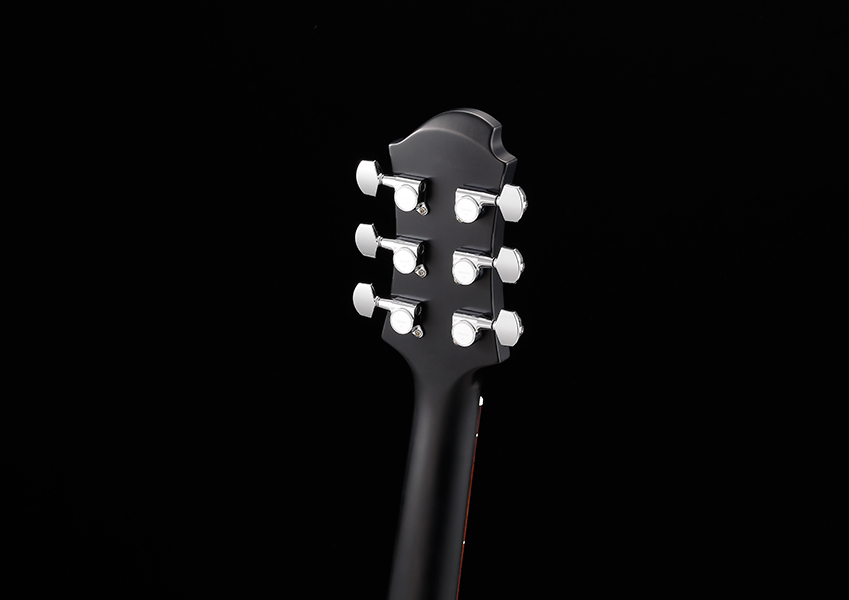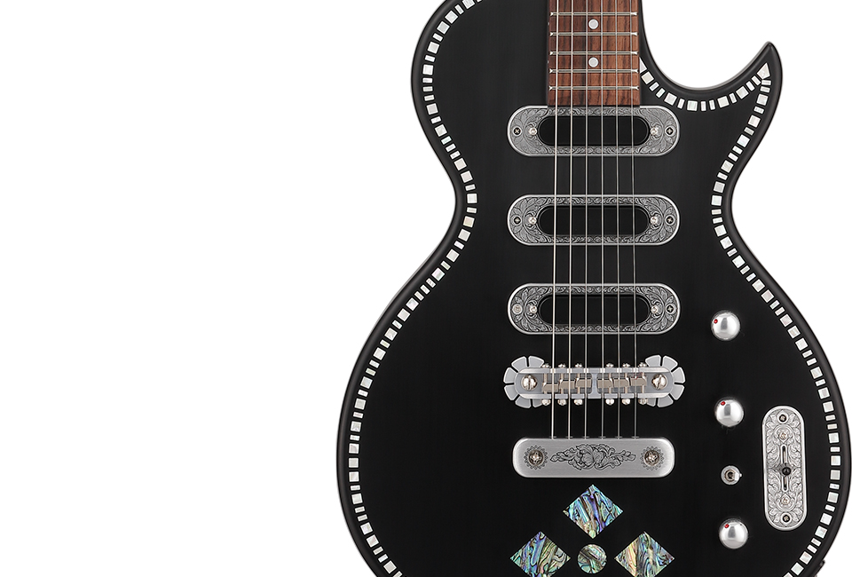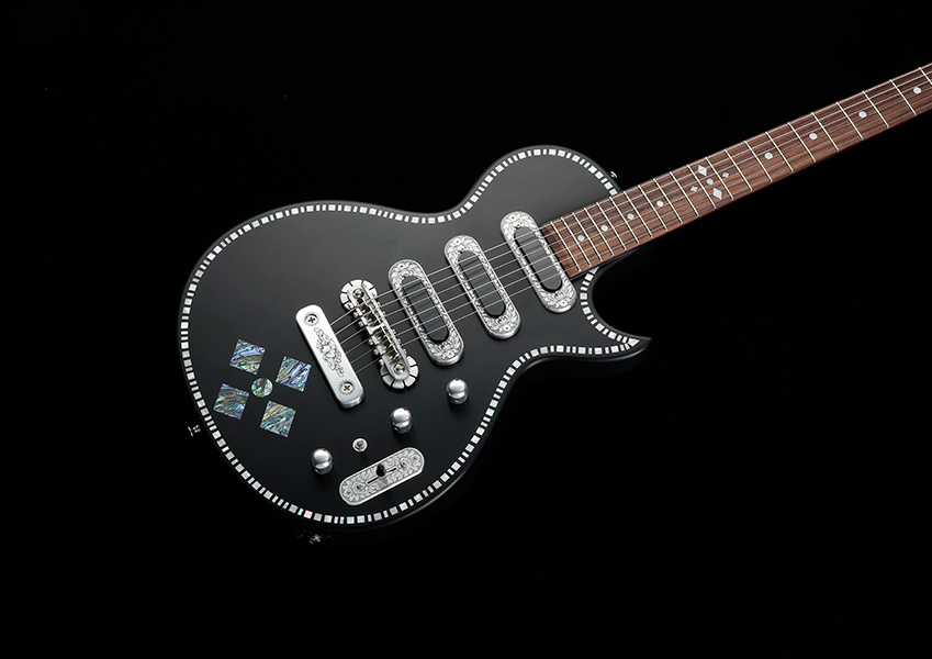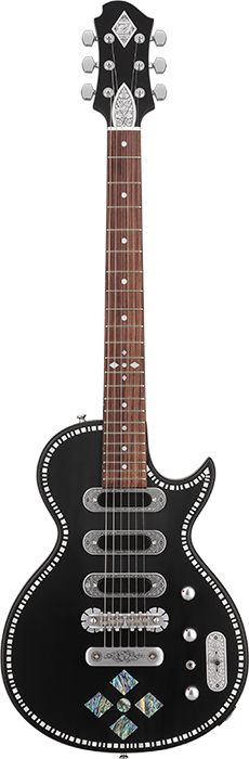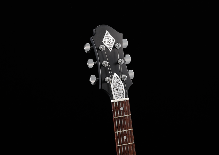 ヘアラインの入ったマット・フィニッシュのブラック・ボディは、ボディ外周のマザー・オブ・パールによるインレイとアバロン貝によるデザインが美しいコントラストを描き、ステージ上でのプレイヤーを彩るであろう。