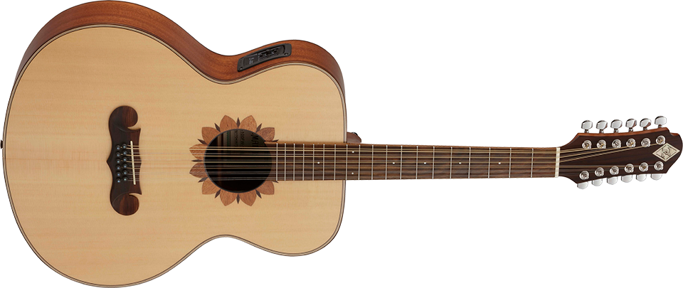 ダイヤモンド・インレイが輝く特徴的なヘッドストックを持ったネックはマホガニー、フィンガーボードにはブラックウッドを採用した12フレット・ジョイントのモデルで、ゼマイティスならではフラワー・デザインのロゼッタを装飾したラウンド・サウンドホールとマスターシュ・ブリッジのオリジナル・デザインも魅力的な12弦ギターです。