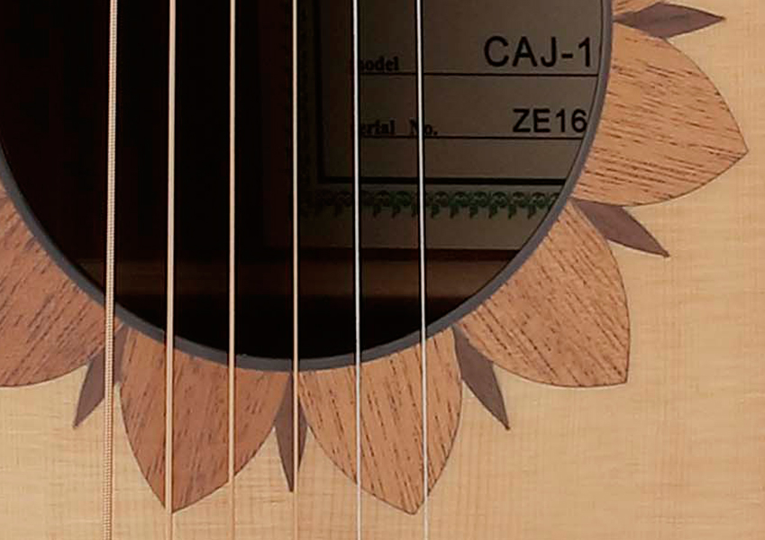 2フラワーをイメージしたサウンド・ホール周りのロゼッタ。※写真は6弦のモデルです。