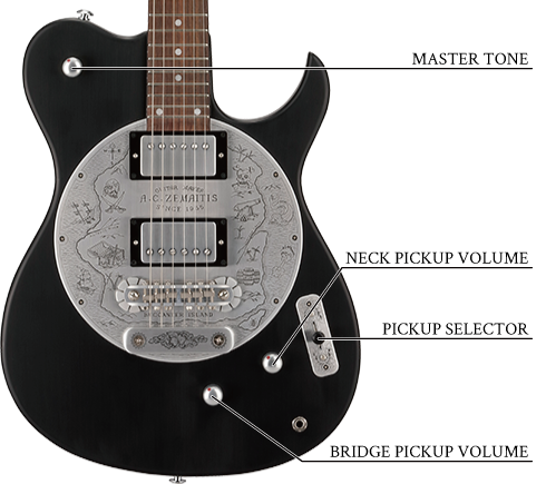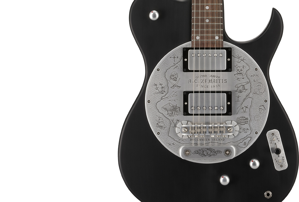 A24DF 2H BUCCANEER ISLANDは、マスター・エングレイヴァーのダニー・オブライエンのデザインによるバッカニアー・アイランド(海賊島)と名付けられた2ハムバッキング・スタイルのラウンド・ディスクを採用したモデルです。