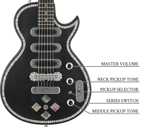 1ダイヤモンド・インレイとボディ外周のインレイがブラックのボディに華を添える。フロントないしリアポジション時にミニスイッチでシリーズの切り替えが可能。