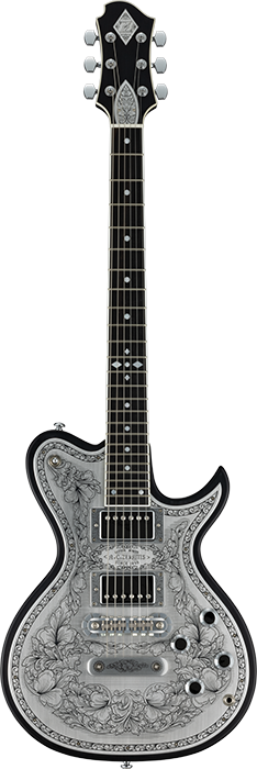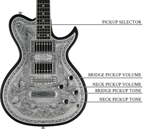 同様にアルミ合金を用いたヘッドのダイアモンド・エンブレム、トラスロッド・カバー、テイルピースやピックアップ・リングをはじめ、アウトプット・ジャック・プレート、コントロール&スイッチ・バック・プレートに至るまで彫金を施しています。