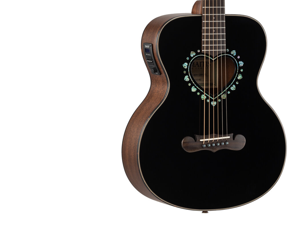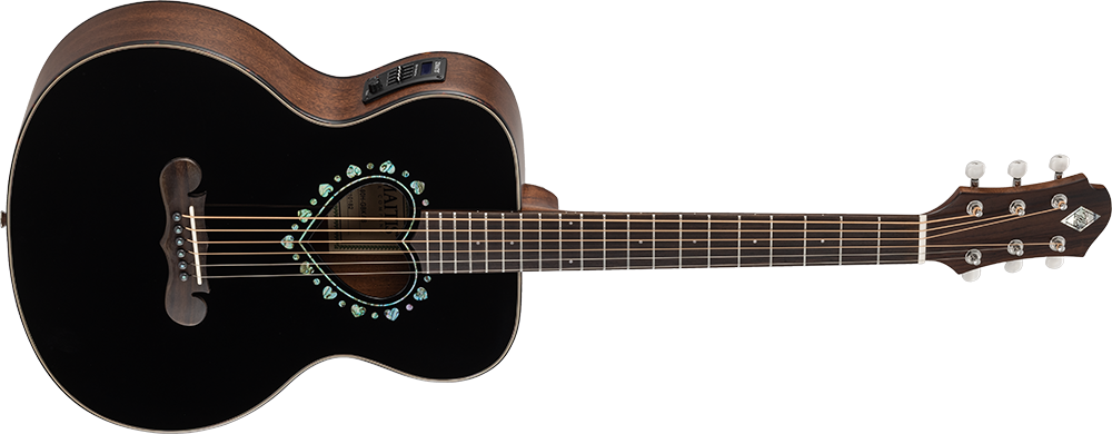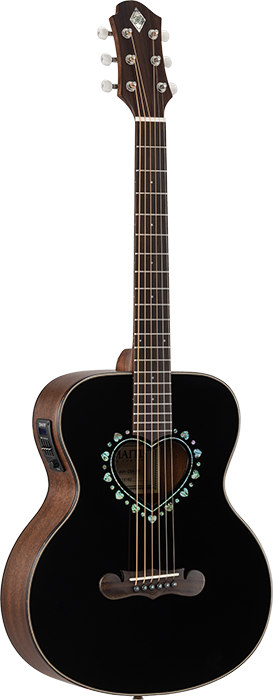 ハート型サウンドホールで演奏性に優れた600mmスケールを採用したCAM-90Hは、マザー・オブ・パールのダイヤモンド・インレイが輝く特徴的なヘッドストックを持ったマホガニー・ネックにローズウッド・フィンガーボードを採用した20フレット仕様の14フレット・ジョイントで、誰にでも手軽に楽しめる小ぶりなミニ・ボディー・サイズのエレアコです。