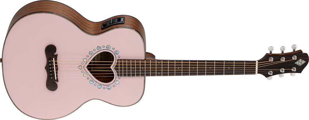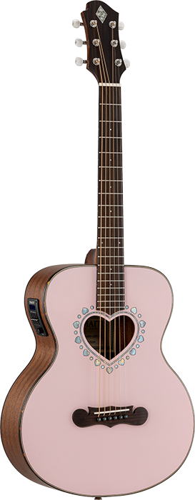 ハート型サウンドホールで演奏性に優れた600mmスケールを採用したCAM-90Hは、マザー・オブ・パールのダイヤモンド・インレイが輝く特徴的なヘッドストックを持ったマホガニー・ネックにローズウッド・フィンガーボードを採用した20フレット仕様の14フレット・ジョイントで、誰にでも手軽に楽しめる小ぶりなミニ・ボディー・サイズのエレアコです。