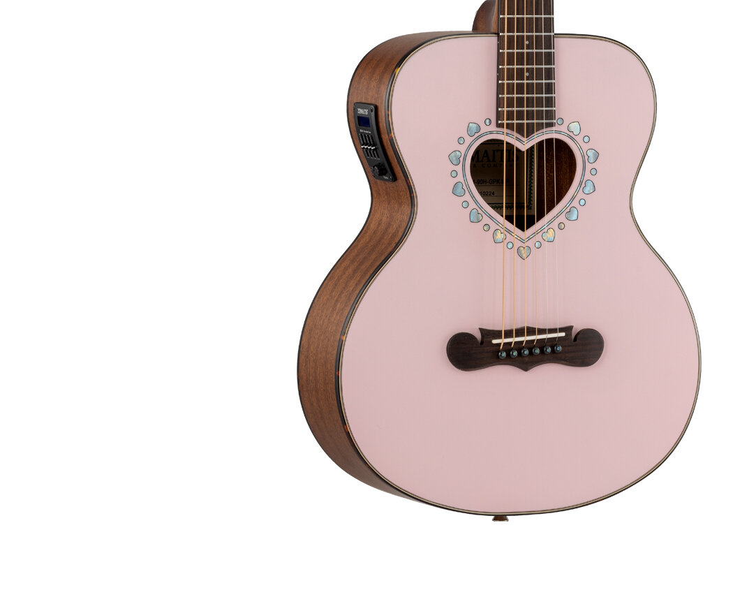 サウンドに広がりを与えるハート形状のサウンドホールと、ハートとドットが交互にちりばめられたマザー・オブ・パール柄のロゼッタ