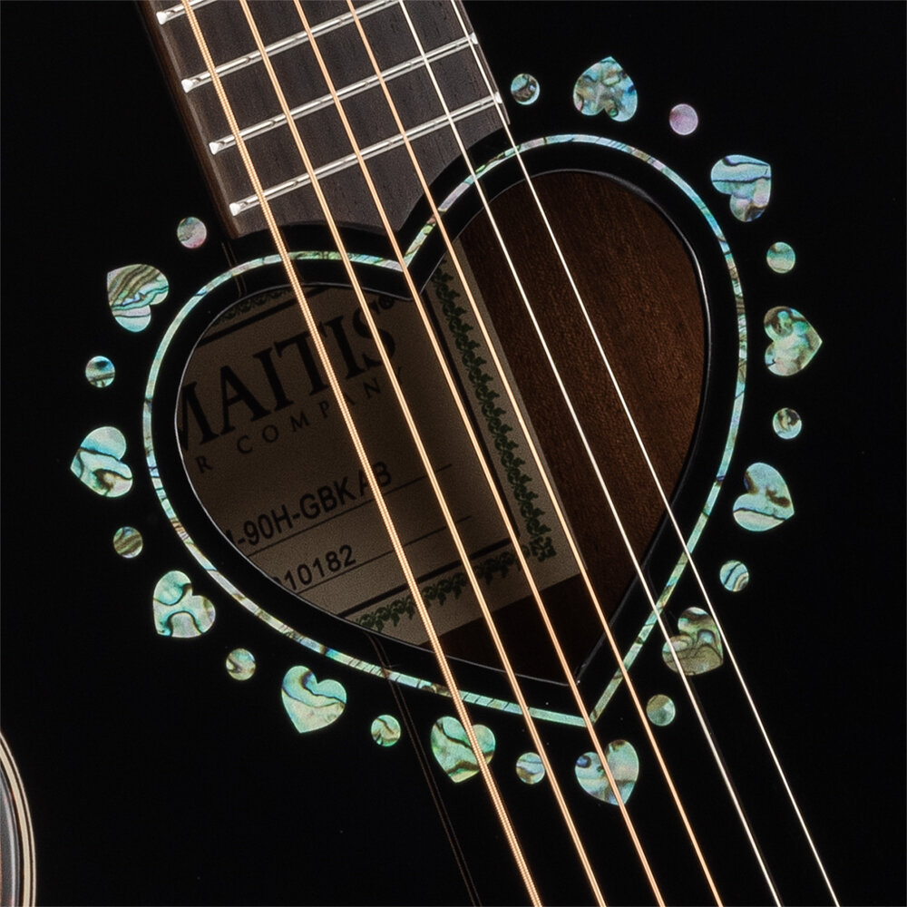ゼマイティスの伝統的なハート型のサウンドホール、その周縁に施されたアバロン柄のハートをちりばめたロゼッタ、マスターシュ・ブリッジのオリジナル・デザインは、非常に魅力的です。