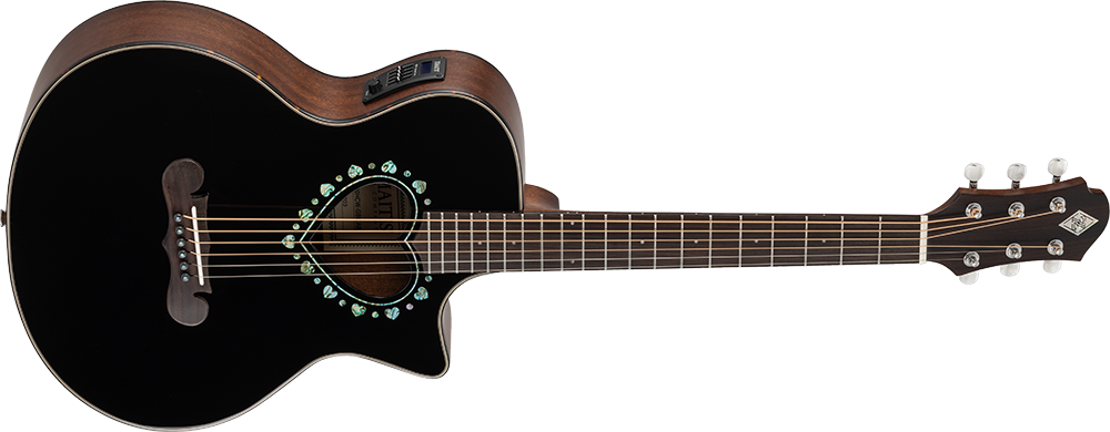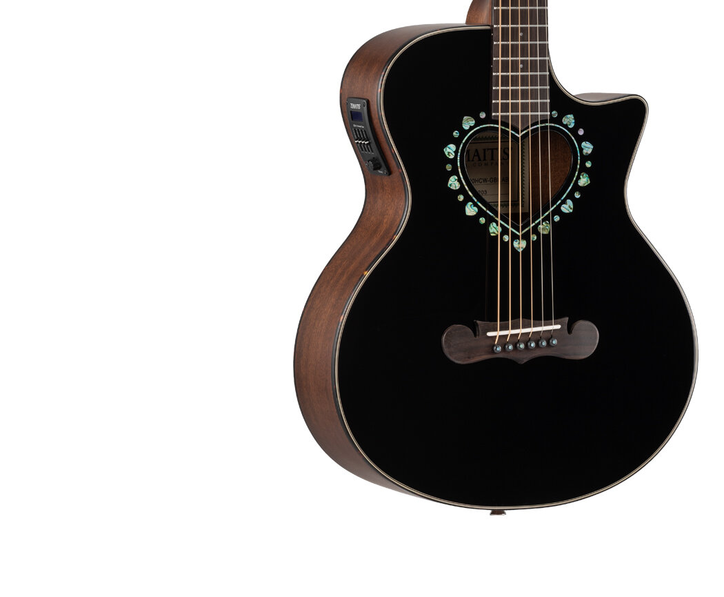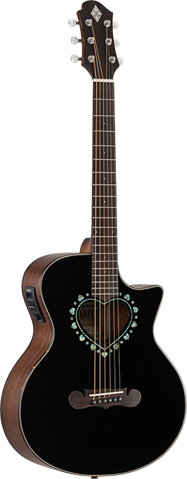 ハート型サウンドホールで演奏性に優れた600mmスケールを採用したCAM-90HCWは、マザー・オブ・パールのダイヤモンド・インレイが輝く特徴的なヘッドストックを持ったマホガニー・ネックにローズウッド・フィンガーボードを採用した20フレット仕様の14フレット・ジョイントで、誰にでも手軽に楽しめる小ぶりなミニ・ボディー・サイズのカッタウェイ・モデルのエレアコです。