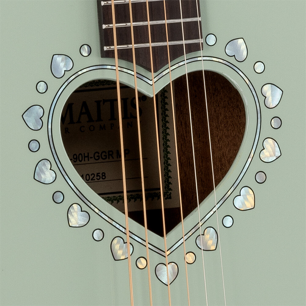 サウンドに広がりを与えるハート形状のサウンドホールと、ハートとドットが交互にちりばめられたマザー・オブ・パール柄のロゼッタ