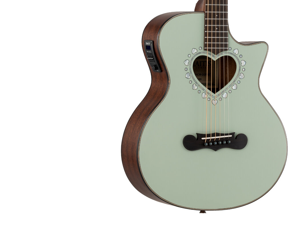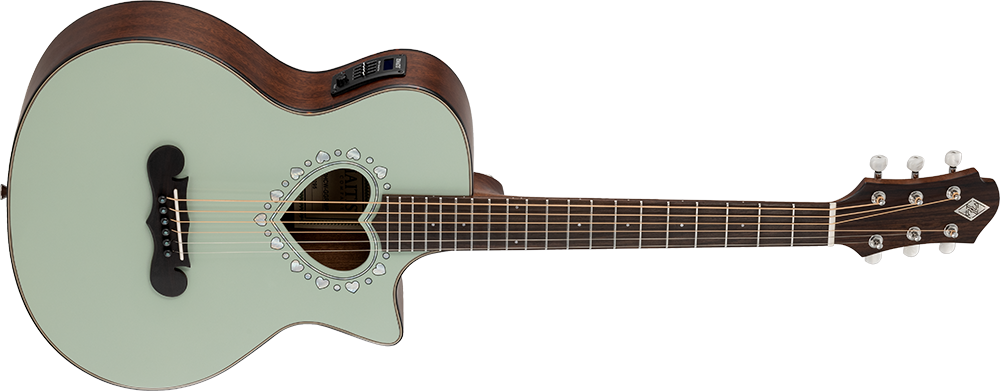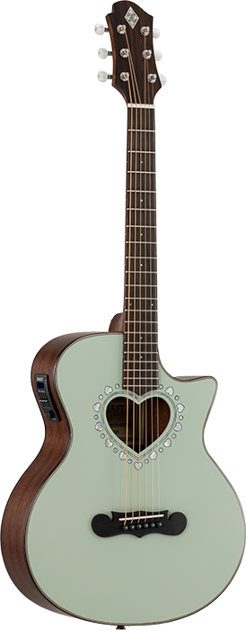 ハート型サウンドホールで演奏性に優れた600mmスケールを採用したCAM-90HCWは、マザー・オブ・パールのダイヤモンド・インレイが輝く特徴的なヘッドストックを持ったマホガニー・ネックにローズウッド・フィンガーボードを採用した20フレット仕様の14フレット・ジョイントで、誰にでも手軽に楽しめる小ぶりなミニ・ボディー・サイズのカッタウェイ・モデルのエレアコです。