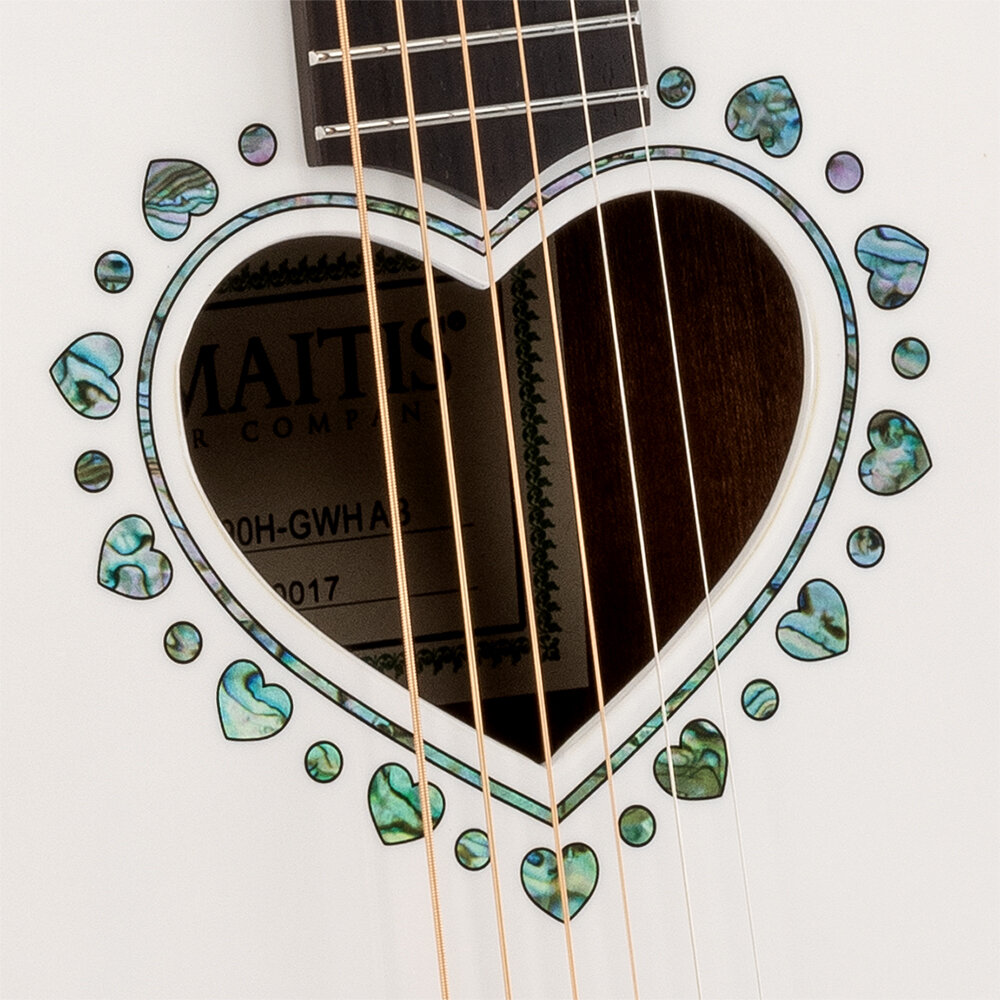 サウンドに広がりを与えるハート形状のサウンドホールと、ハートとドットが交互にちりばめられたアバロン柄のロゼッタ