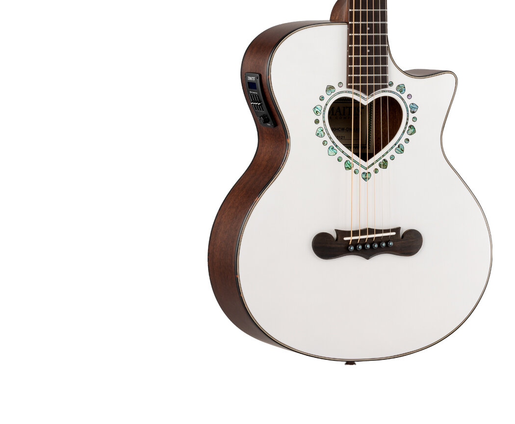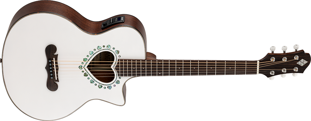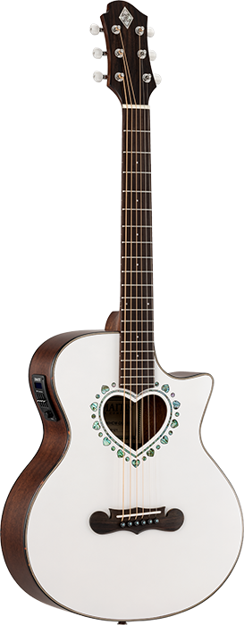 ハート型サウンドホールで演奏性に優れた600mmスケールを採用したCAM-90HCWは、マザー・オブ・パールのダイヤモンド・インレイが輝く特徴的なヘッドストックを持ったマホガニー・ネックにローズウッド・フィンガーボードを採用した20フレット仕様の14フレット・ジョイントで、誰にでも手軽に楽しめる小ぶりなミニ・ボディー・サイズのカッタウェイ・モデルのエレアコです。
