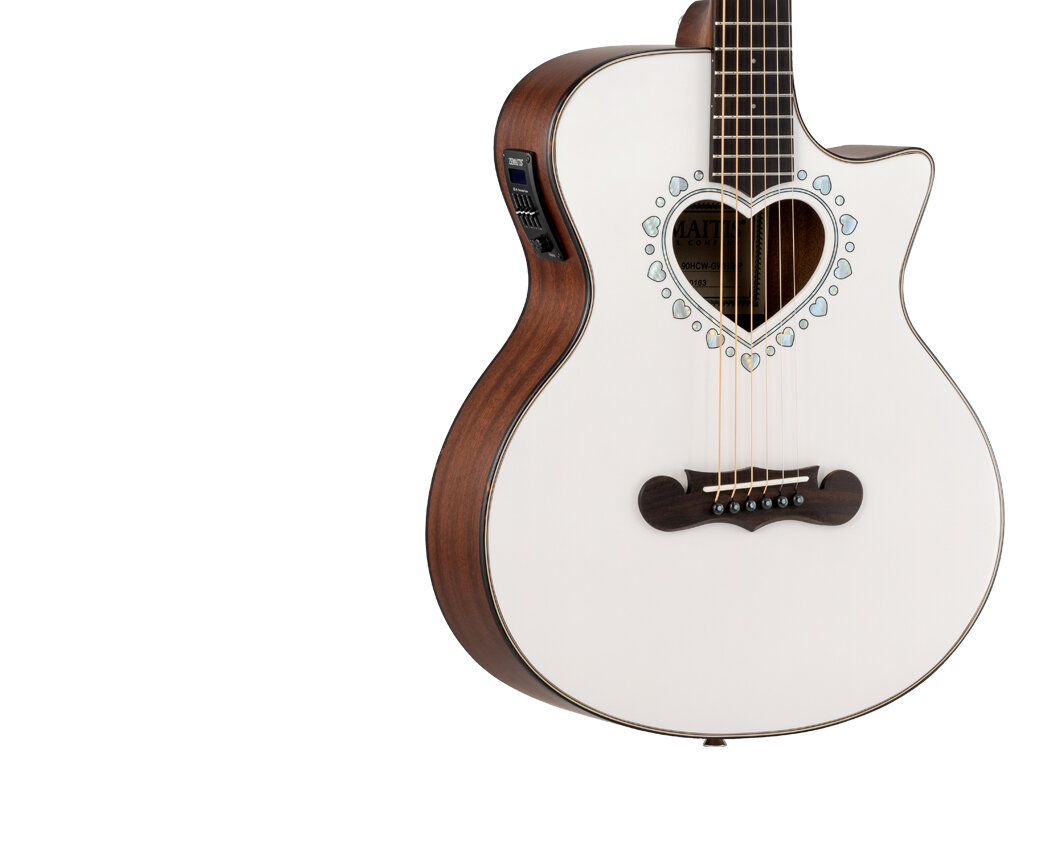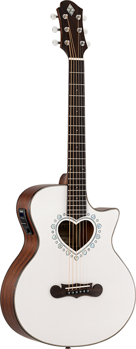ハート型サウンドホールで演奏性に優れた600mmスケールを採用したCAM-90HCWは、マザー・オブ・パールのダイヤモンド・インレイが輝く特徴的なヘッドストックを持ったマホガニー・ネックにローズウッド・フィンガーボードを採用した20フレット仕様の14フレット・ジョイントで、誰にでも手軽に楽しめる小ぶりなミニ・ボディー・サイズのカッタウェイ・モデルのエレアコです。