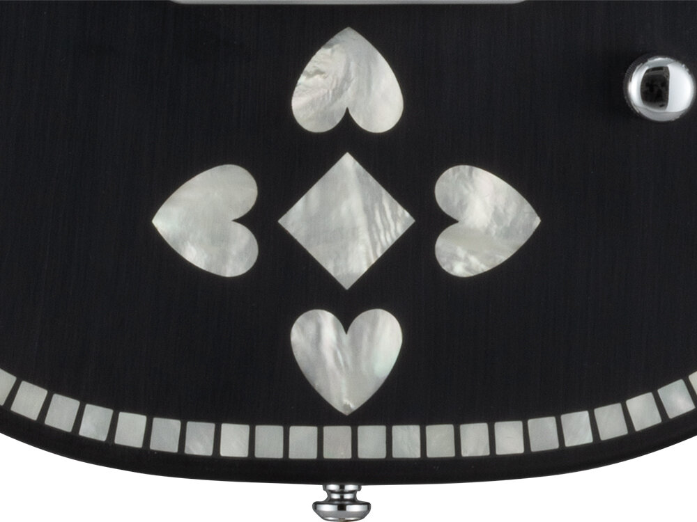 トップにあるブリッジ後方のインレイは、厚みのあるホワイト・マザー・オブ・パールを使用し、中心の丸に4つのハート形を配列したゼマイティスの伝統的なデザイン